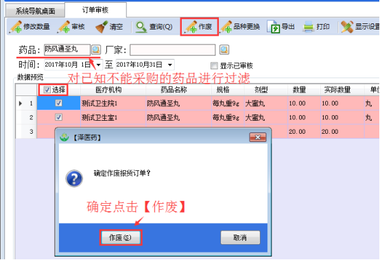 對已知不能采購的藥品進(jìn)行過濾篩選,單個或批量作廢,作廢即報貨失敗;